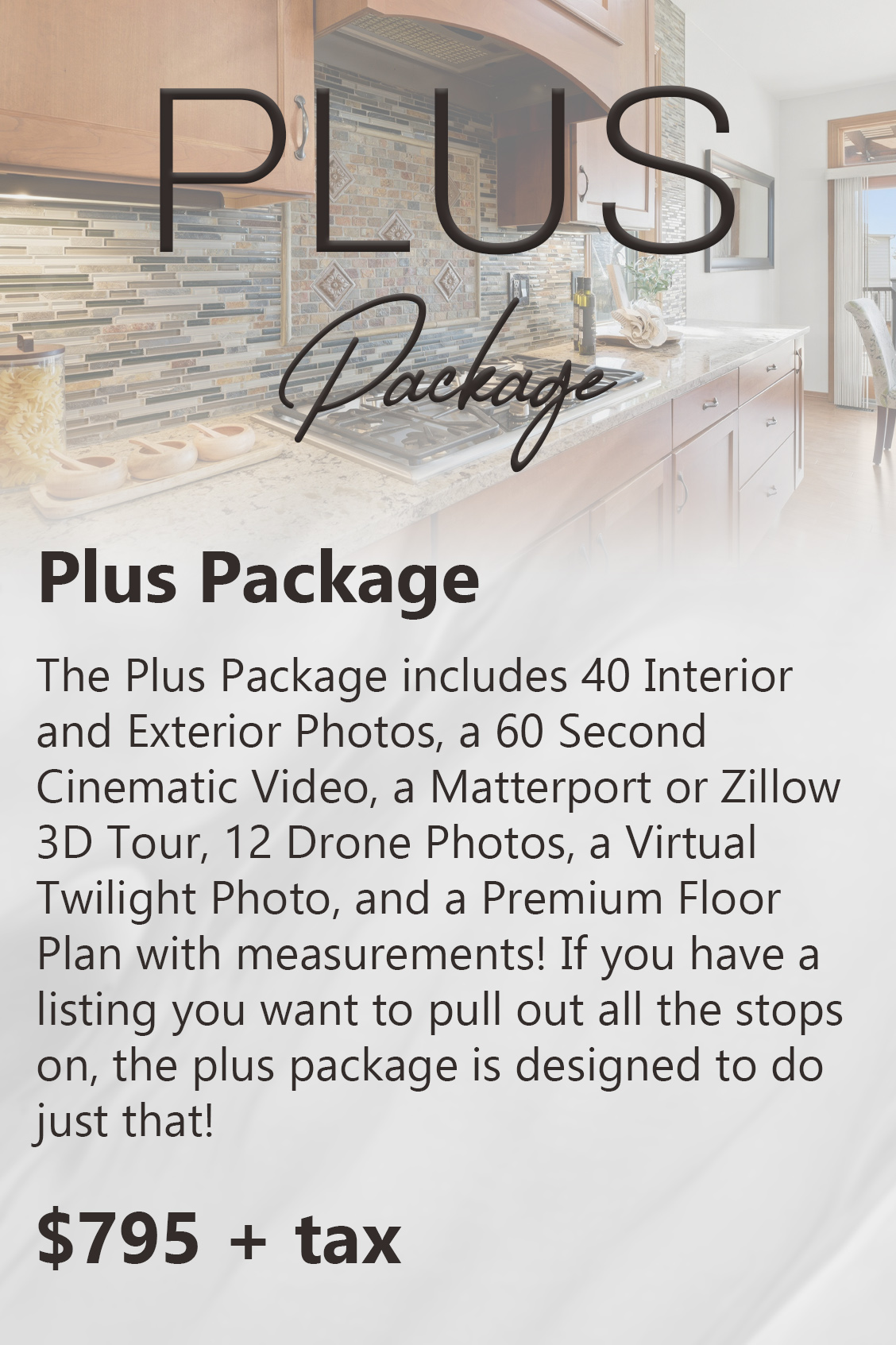 60-second videos with drone and standard video start at $295. Vertical social media reels and video are $175.